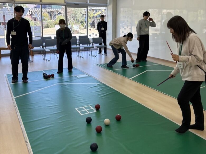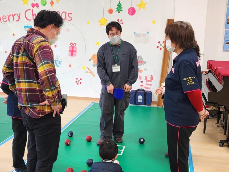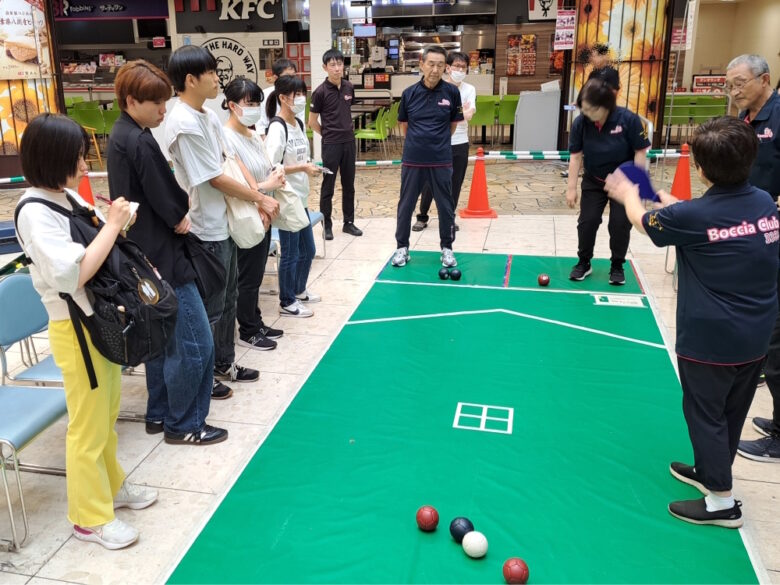 体験会の会場では、高齢者の皆さんが子どもたちやボランティアスタッフである大学生たちと一緒にボッチャを楽しむこともあり、多世代交流の場にもなっていました。